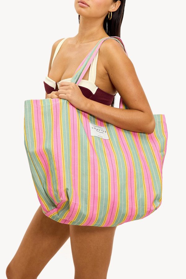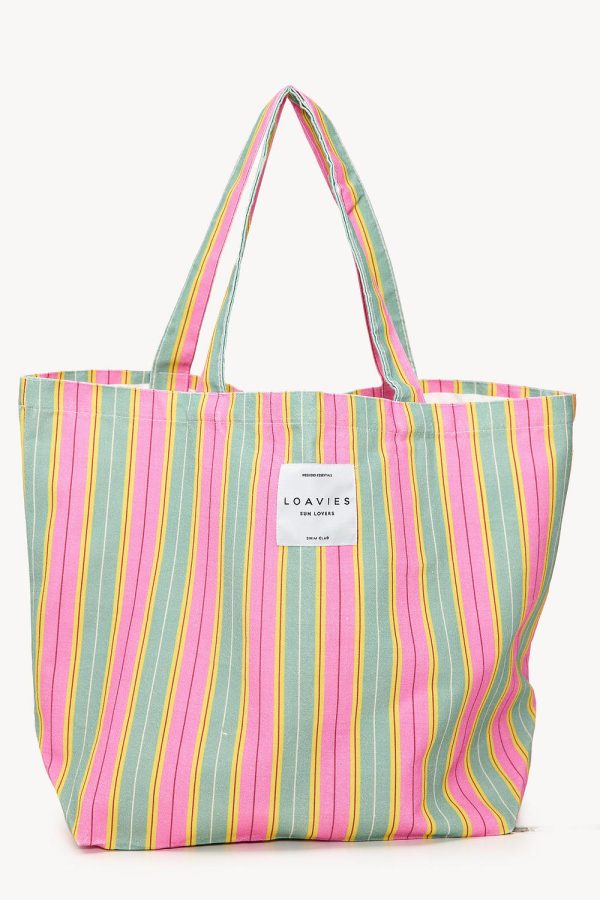 Deze ruime beach bag heeft een on trend design met verticale strepen in mint groen en roze tinten. De oversized tote heeft stevige handvatten en een LOAVIES label voor een signature touch. Perfect voor een relaxte beach day of shopping spree.