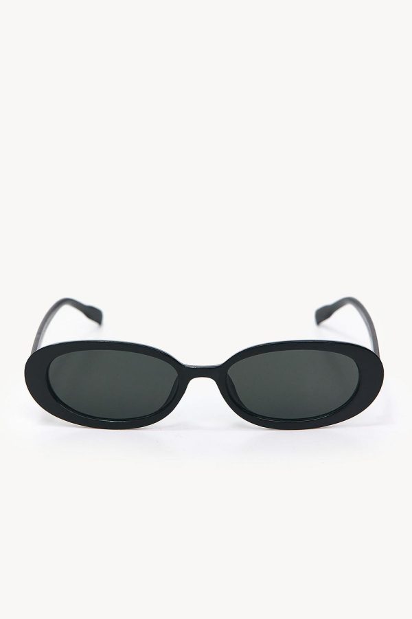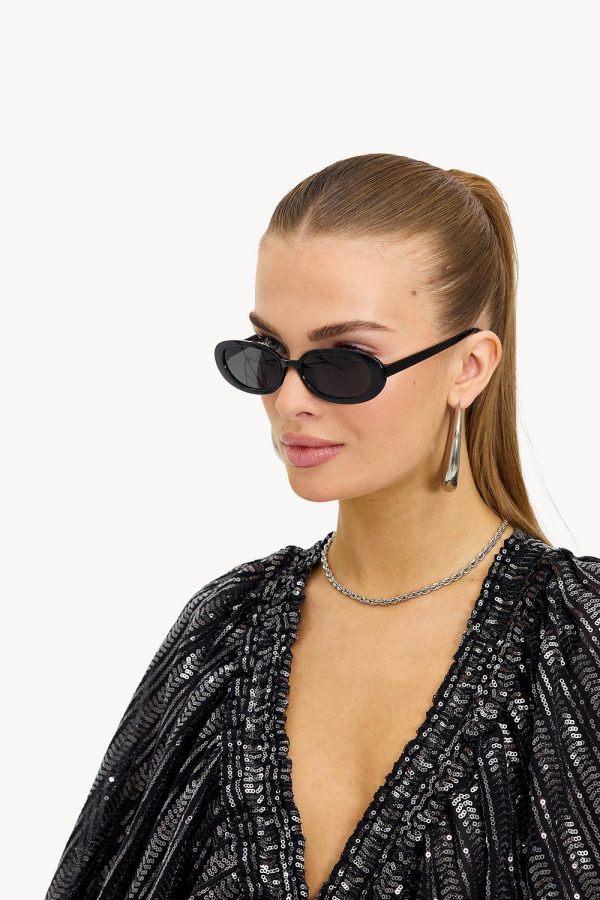 Deze zwarte oval sunglasses hebben een statement retro design met smalle glazen. De matte finish en subtiele cat-eye vorm geven een coole twist aan deze zonnebril. De stevige plastic frame zorgt voor een luxe uitstraling.