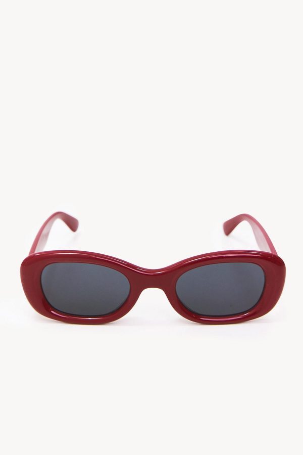 Deze bordeauxrode zonnebril heeft een statement oval frame in retro design. De donkere glazen en brede poten geven een coole twist aan deze acetaat bril. Style deze shades met statement oorbellen voor een on trend look.