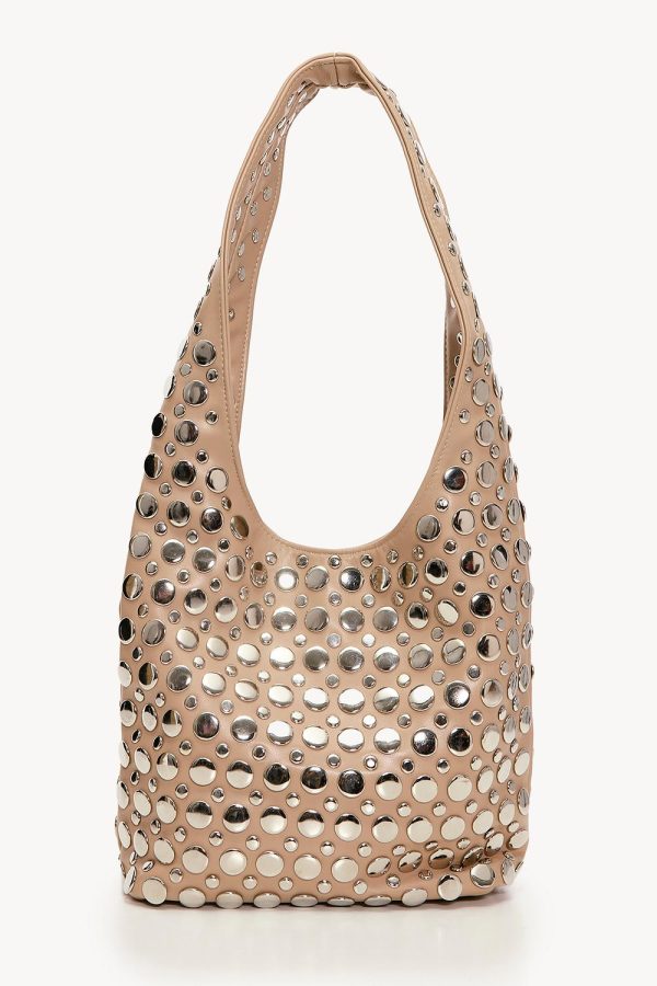 Deze beige shoulder bag heeft een opvallend design met shiny studs in een all-over patroon. De ruime vorm met schouderband maakt deze tas perfect voor een shopping spree. Het metallic effect van de details geeft deze statement bag een luxe touch.