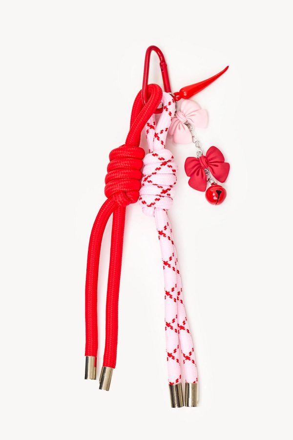 Deze schattige telefoonkabel heeft een roze en rode duo-tone design met een stijlvol ruitpatroon. De kabel is versierd met een decoratieve roze strik en een charmante rode strik bedel met belletje. De duurzame polyester afwerking zorgt voor een lange levensduur.
