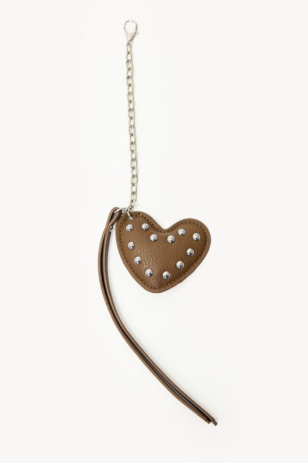 Deze bruine bag charm heeft een statement heart design met shiny studs details. De zilveren chain en subtiele fringe zorgen voor een luxe touch. Het vegan leather design geeft deze accessoire een chique uitstraling.