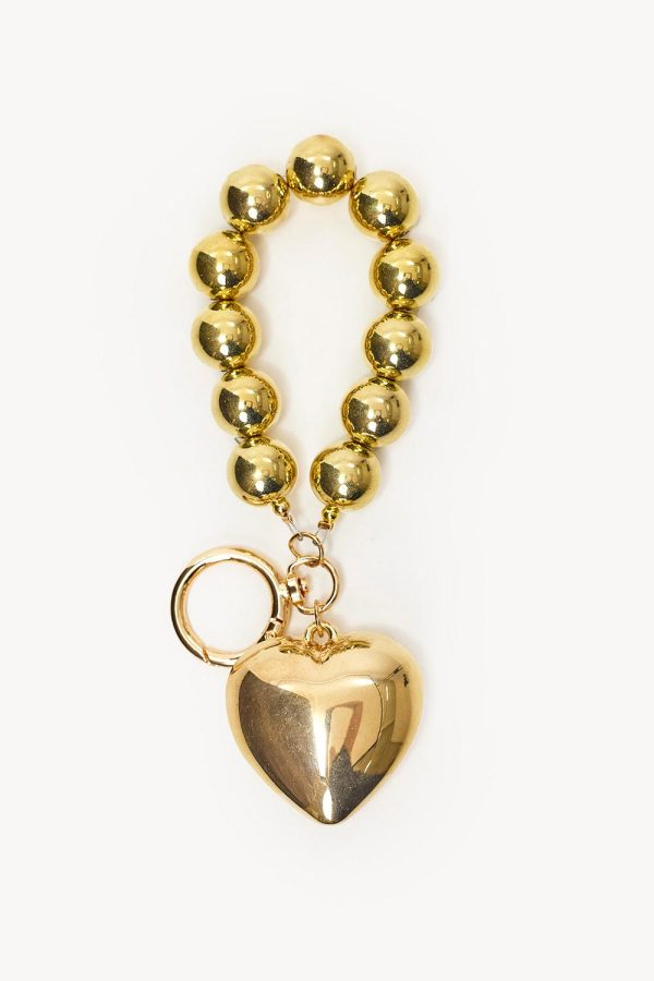 Deze goudkleurige armband heeft een luxe design met statement bollen en een hart bedel. De metalen ketting met glanzende afwerking en karabijnsluiting creëert een chique look. De opvallende hart charm geeft deze armband een coole twist.