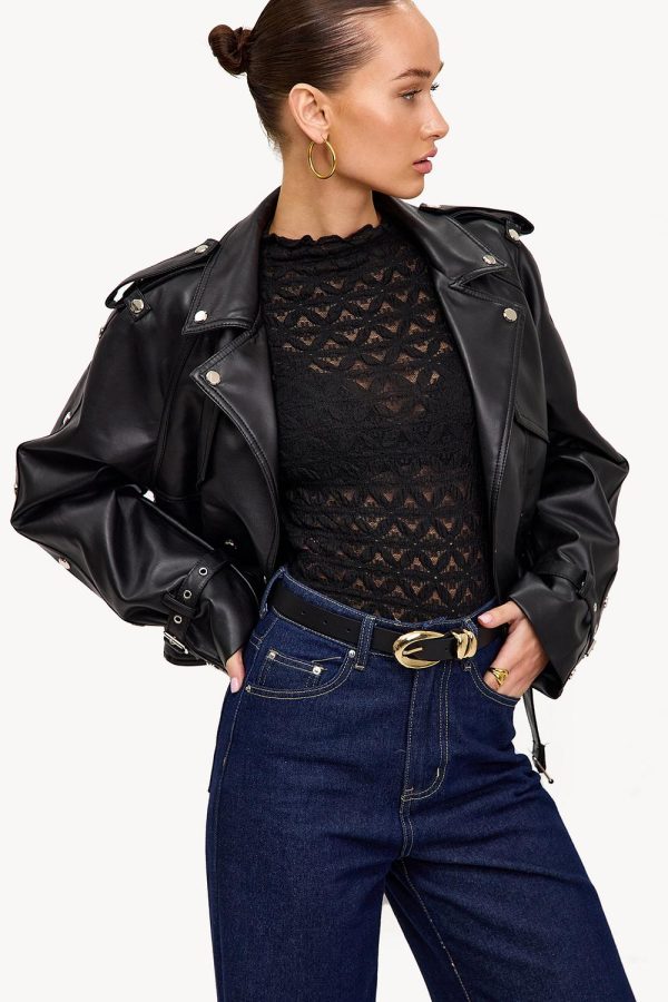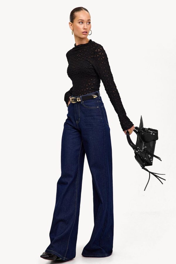 Deze top heeft een hoge halslijn, lange mouwen en een doorschijnende stof met structuur.Model informatie: Berenika is 172 cm en draagt maat XS.