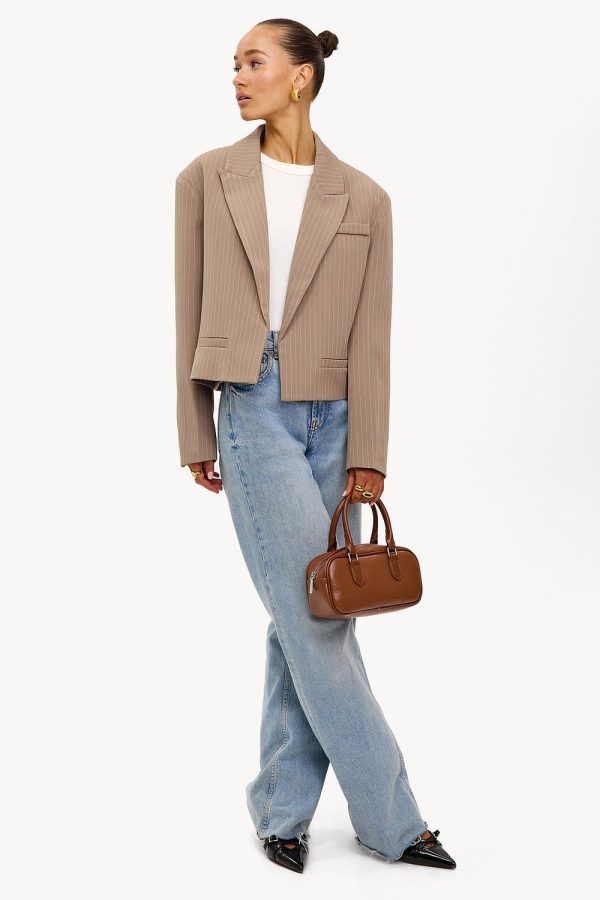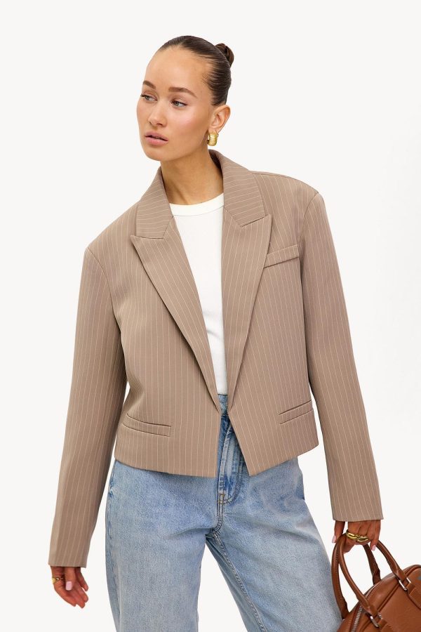 Deze taupe blazer heeft een subtiel pinstripe design en een cropped fit. De tailored pasvorm met statement revers en zakdetails creëert een moderne look. Style deze blazer met een lichte denim voor een on trend office look.Model informatie: Berenika is 172 cm en draagt maat XS.