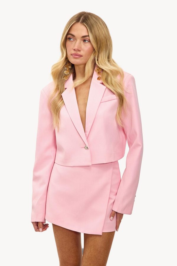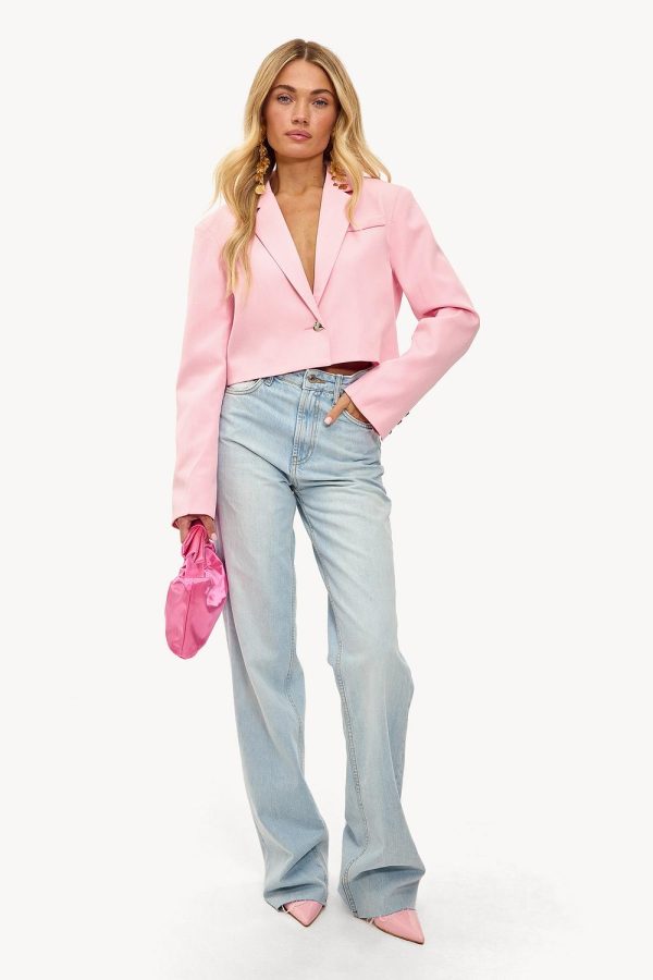 Deze roze cropped blazer heeft een strakke tailored fit met statement heart-shaped button. De korte pasvorm met klassieke revers en clean design creëert een moderne look. Style deze blazer met een wide leg jeans voor een chique casual outfit.Model informatie: Devon is 174 cm en draagt maat XS.
