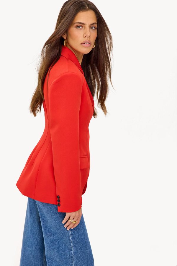 Deze rode blazer heeft een stijlvolle asymmetrische sluiting met statement button detail. De tailored fit met klassieke revers en flap pockets creëert een elegante shape. Style deze blazer met een wide leg jeans voor een coole office look.Model informatie: Jools is 176 cm en draagt maat S.