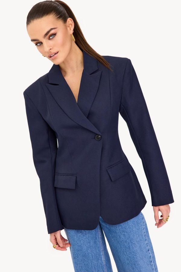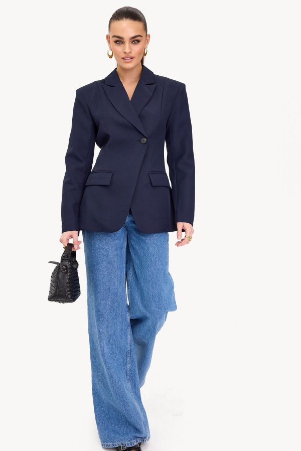 Deze navy blazer heeft een chique tailored fit met statement schouders. De asymmetrische sluiting met enkele knoop en getailleerde pasvorm creëren een moderne shape. Style deze blazer met een wide leg jeans voor een coole office look.Model informatie: Freya is 175 cm en draagt maat XS.