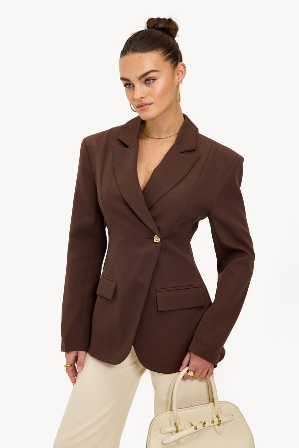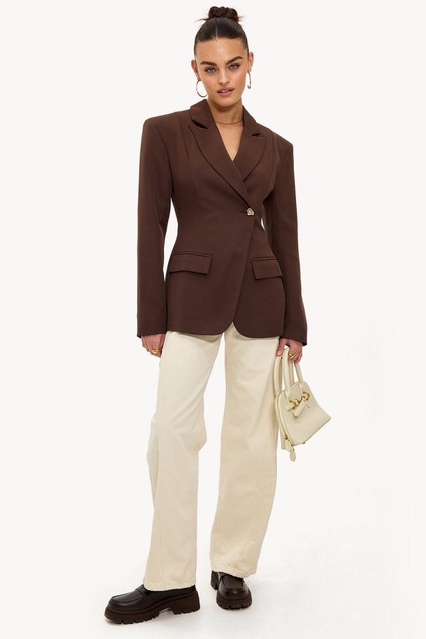 Deze chocoladebruine blazer heeft een tailored fit met statement gouden button. De asymmetrische voorkant en getailleerde pasvorm creëren een sophisticated shape. De klassieke zakken geven deze blazer een luxe twist.