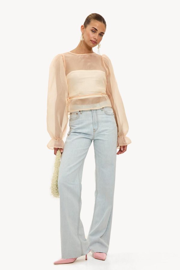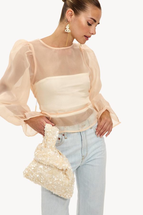 Deze blouse heeft ballon mouwen, strikkoordjes aan de achterkant, een hoge hals en een organza stof.