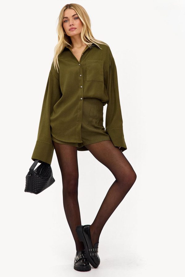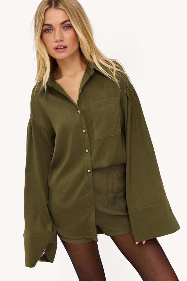 Deze olijfgroene blouse heeft een oversized fit met statement wide sleeves voor een luxe look. De button-up voorzijde met opvallende zilveren knoopjes en patch pockets geven een coole twist. De zachte stretch stof zorgt voor een comfortabele draagbaarheid.Model informatie: Devon is 174 cm en draagt maat XS.