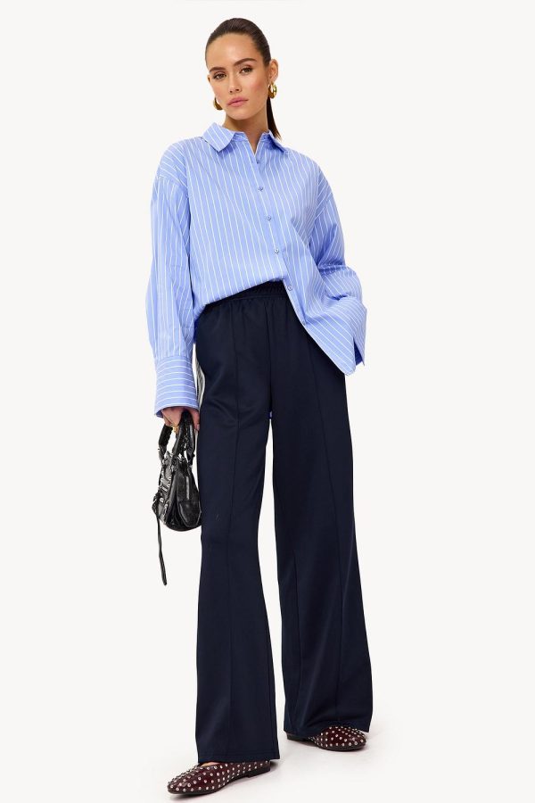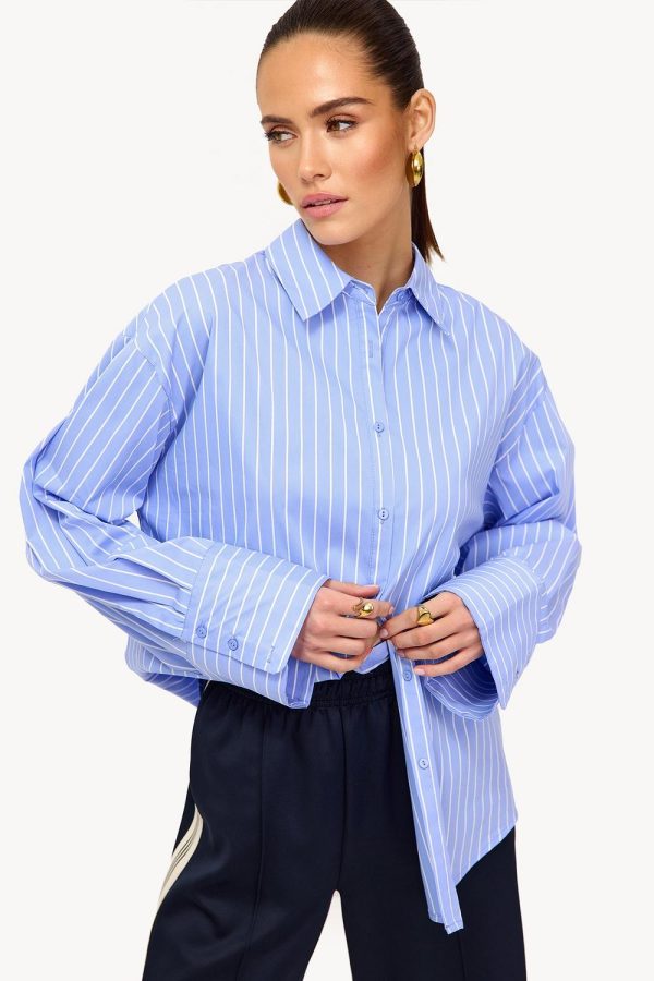 Deze lichtblauwe button-up blouse heeft een klassieke striped print en statement cuffs. De oversized fit met verlengd rugpanel creëert een moderne twist op het tijdloze design. De luxe katoenkwaliteit maakt deze blouse perfect voor een coole office look.Model informatie: Alessandra is 174 cm en draagt maat XS.
