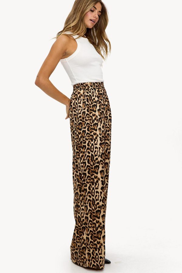 Deze statement wide leg broek heeft een luxe leopard print in bruintinten. De hoge taille met elastische band en losvallende pijpen creëren een elegante shape.