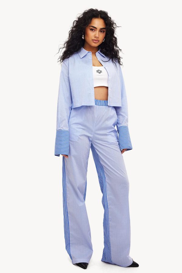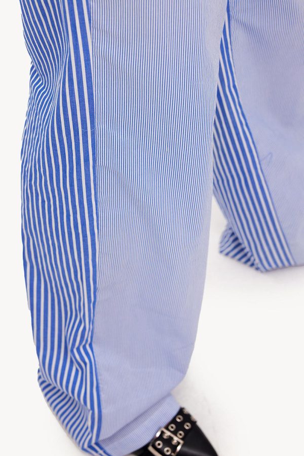 Deze broek heeft verschillende soorten strepen aan de voor- en achterkant, rechte broekspijpen, steekzakken en een elastische tailleband.Model informatie: Wendell is 170 cm en draagt maat XS.