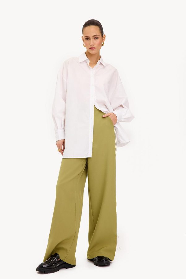 Deze salie groene wide leg pants heeft opvallende witte strepen aan de zijkant voor een sportieve twist. De high-waisted fit met extra wijde pijpen zorgt voor een statement look. De decoratieve strikdetails bij de enkels geven deze broek een unieke touch.Model informatie: Alessandra is 174 cm en draagt maat XS.