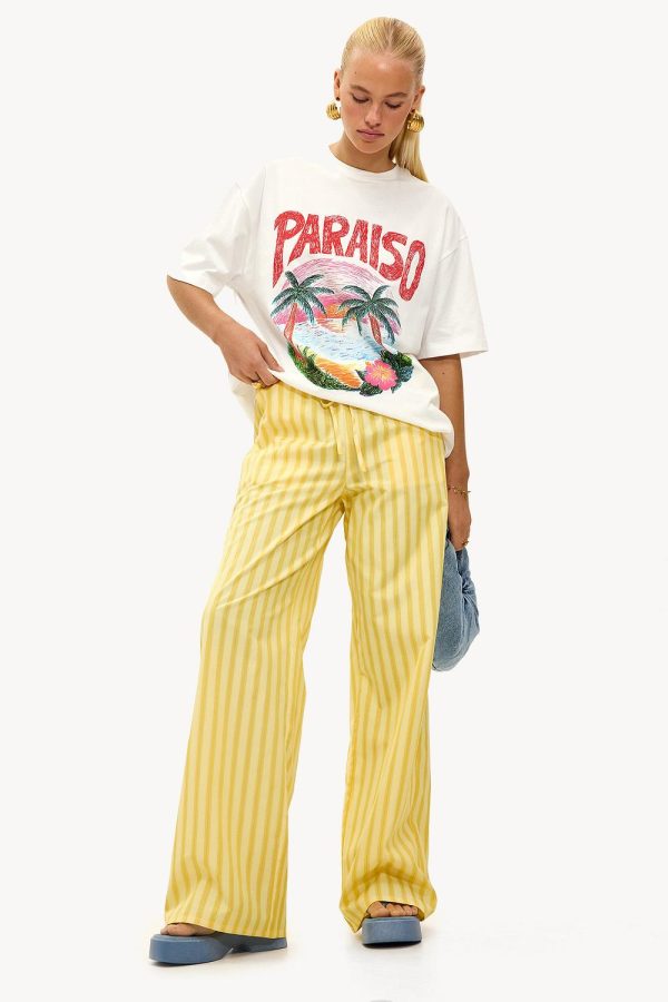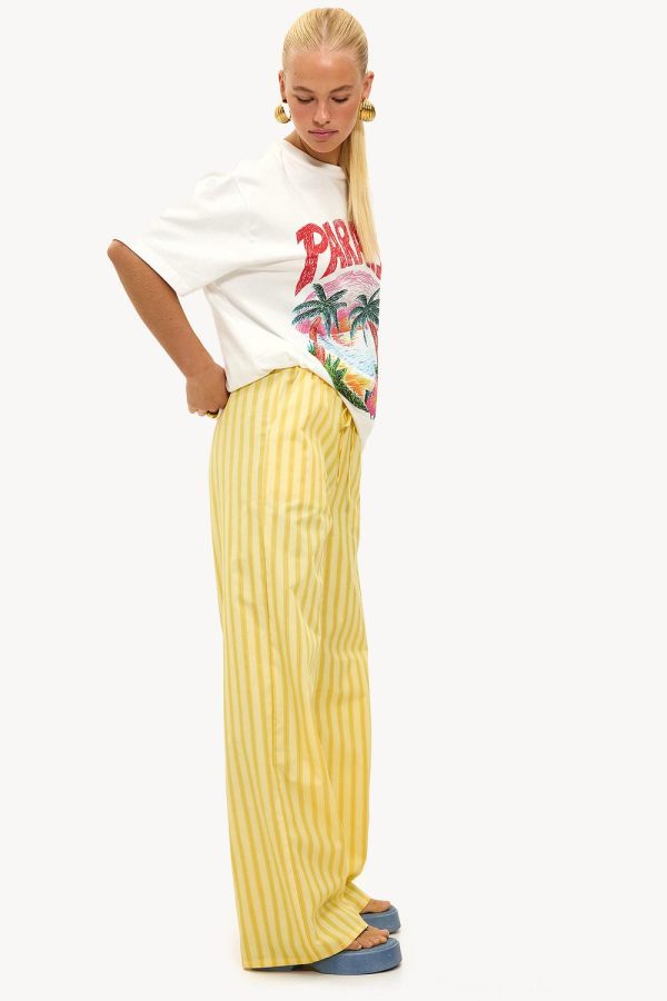 Deze gele wide leg pants heeft een verticaal streepdesign voor een statement look. De relaxte pasvorm met elastische taille en drawstring detail creëert een coole vibe. Style deze broek met een oversized graphic tee voor een on trend casual look.Model informatie: Kathryn is 173 cm en draagt maat S.