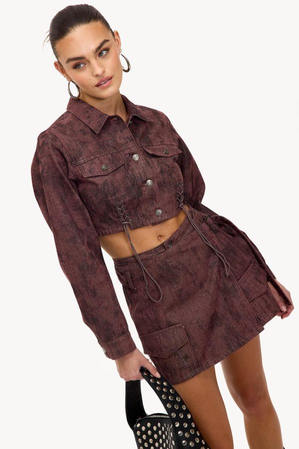 Deze bordeaux skort heeft een coole tie-dye print en statement lace-up details. De cargo-inspired pockets en wrap-style voorkant geven een moderne twist aan het design. Style deze skort met de bijpassende cropped jacket voor een stunning co-ord look.Model informatie: Freya is 175 cm en draagt maat XS.