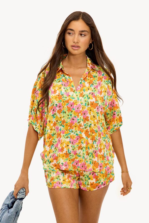 Deze gele blouse heeft een kleurrijk bloemenpatroon en statement butterfly sleeves. De oversized fit met V-neck en button-up design creëert een luxe look. Style deze blouse met de matching shorts voor een stunning co-ord look tijdens een city trip.Model informatie: Shana is 179 cm en draagt maat S.