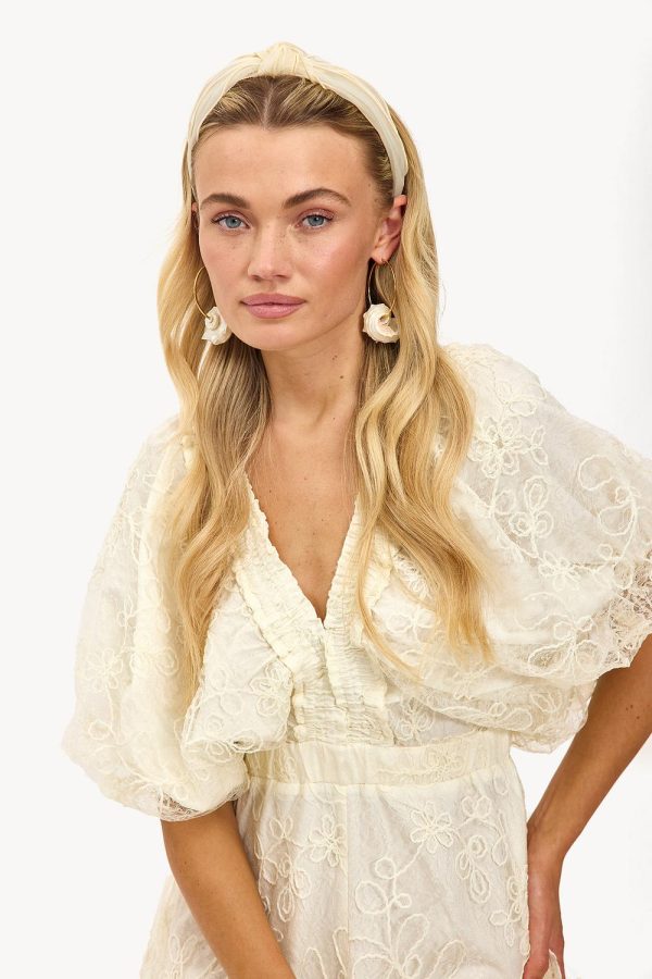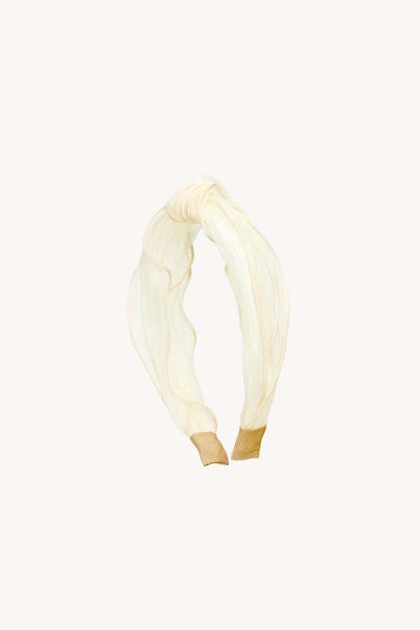 Deze crèmewitte headband heeft een luxe knoop detail voor een chique accent. De zachte textuur en brede vorm creëren een statement look. Style deze headband met je favoriete dress voor een elegante finishing touch.