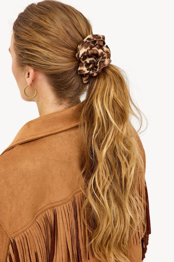 Deze statement scrunchie heeft een luxe leopard print in warme bruintinten. De zachte polyester stof en ruime vorm zorgen voor een comfortabele fit in je haar. Style deze scrunchie met een casual ponytail voor een coole touch aan je look.