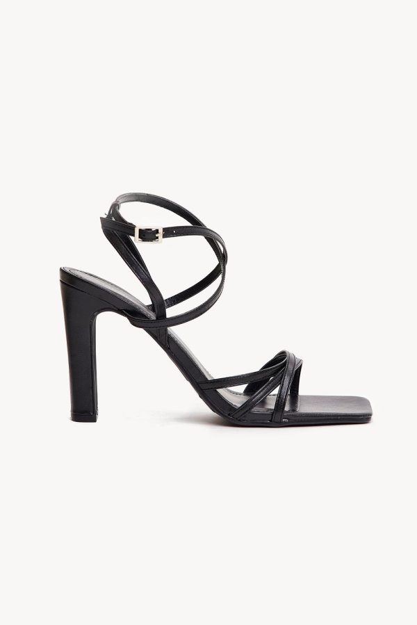 Deze hakken hebben verstelbare bandjes, een vierkante neus en een hoge hak.