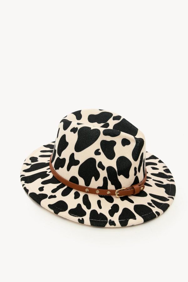 Deze statement fedora hat heeft een opvallende zwart-witte cow print all-over. De brede rand en bruine leather-look band geven deze hat een luxe twist. De klassieke fedora shape maakt van elke outfit een on trend look.