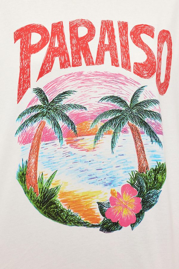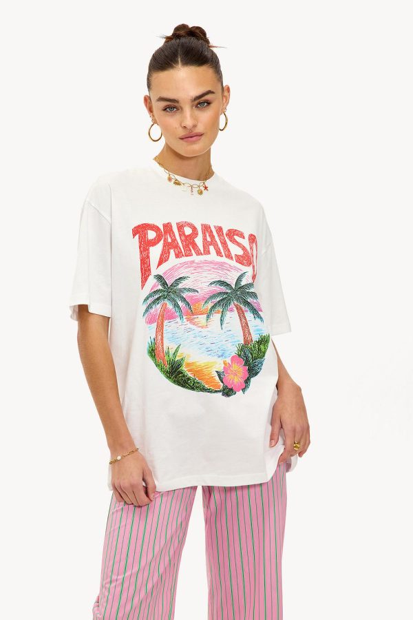 Dit witte oversized T-shirt heeft een statement Paraiso beach print aan de voorzijde. De zachte 100% katoenen kwaliteit en losse fit zorgen voor een comfy gevoel. Style dit shirt met een roze broek voor een coole summer look.Model informatie: Freya is 175 cm en draagt maat XS.