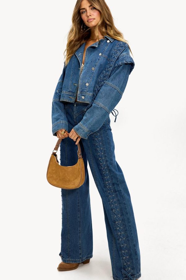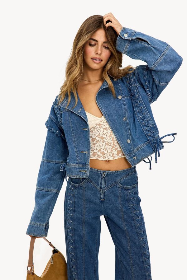 Dit cropped denim jacket heeft statement lace-up details aan de zijkanten voor een coole twist. De oversized fit met button-up voorkant en klassieke kraag geeft een moderne update aan het design. Style deze jacket met de matching jeans voor een on trend denim co-ord look.