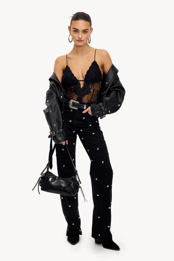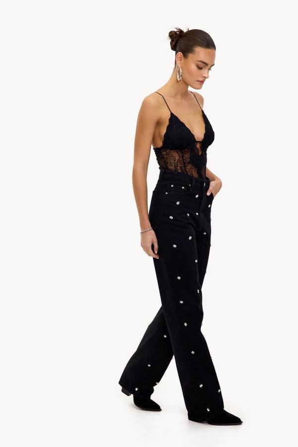Deze zwarte 5-pocket straight jeans heeft een opvallend all-over patroon van zilveren studs. De high-waisted fit met rechte pijpen zorgt voor een statement look. De used black washing geeft deze jeans een coole twist.Model informatie: Freya is 175 cm en draagt maat XS.