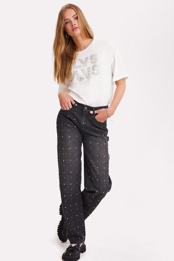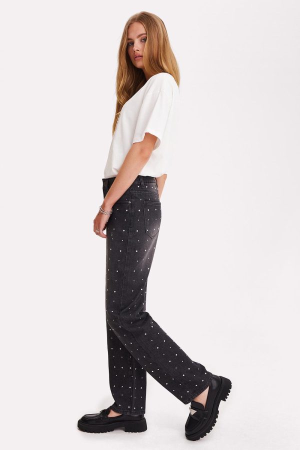 Deze jeans heeft studs, een middelhoge taille, rechte broekspijpen, een rits- en knoopsluiting en zakken aan de voor- en achterkant.