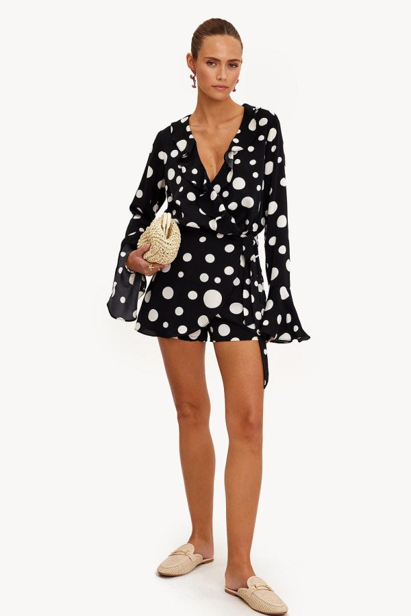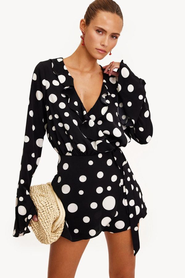 Deze playsuit heeft een v-hals met overslag detail, ruches, een rits aan de zijkant, lange mouwen, een voering en een stippenprint.