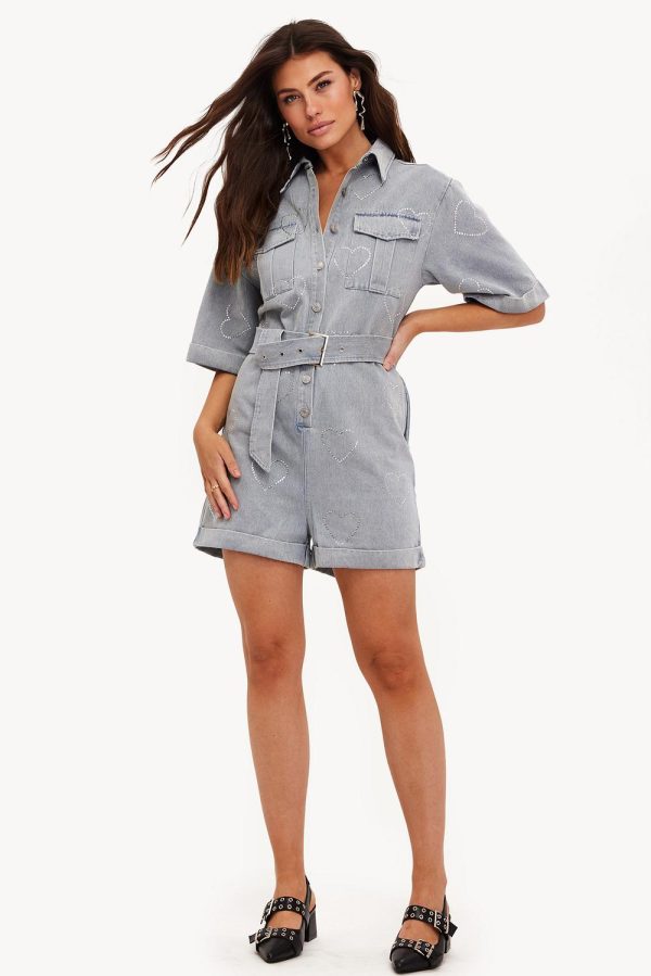 Deze playsuit heeft een denim stof met strass steentjes, korte mouwen, een afneembare riem en een knoopsluiting en zakken aan de voorkant.Model informatie: Carmen is 175 cm en draagt maat S.