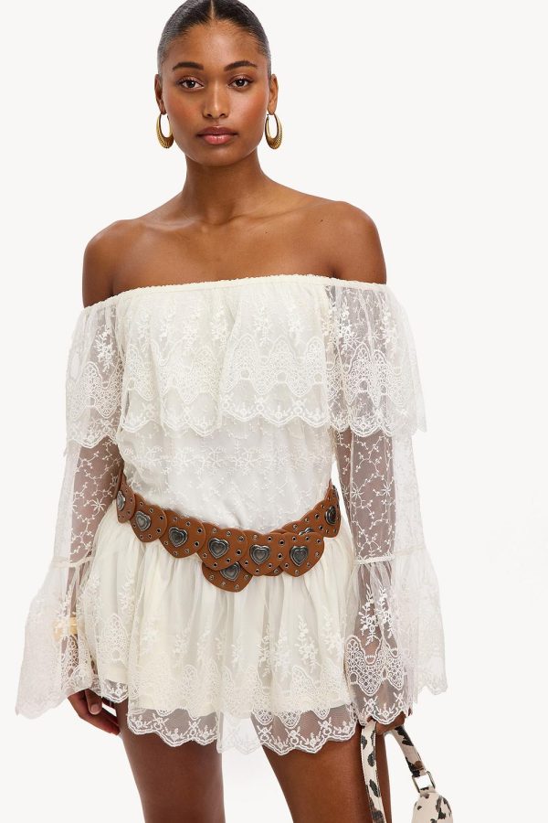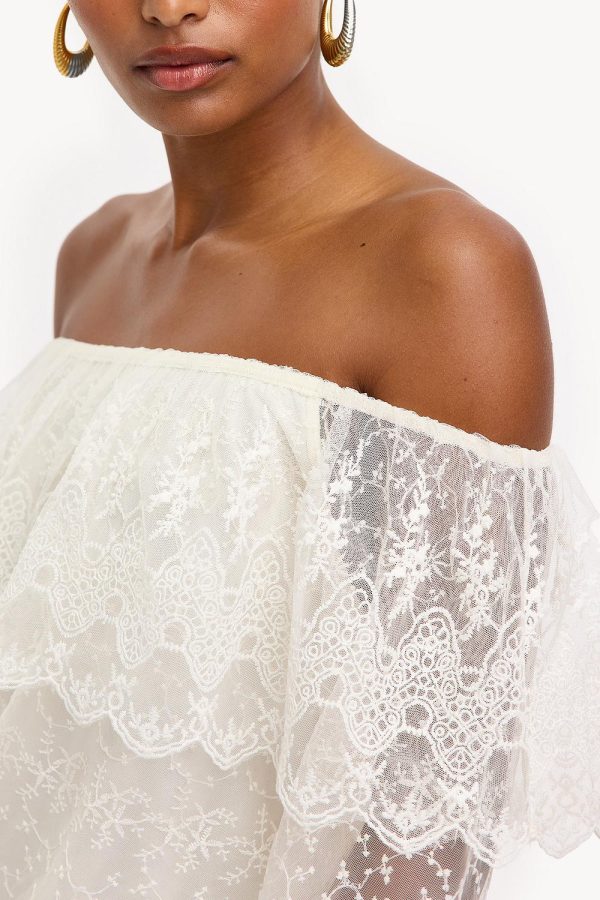 Deze offwhite jurk heeft een luxe kanten design met statement off-shoulder neckline. De transparante bell sleeves en gelaagde ruffle details creëren een romantische look. De elastische taille met subtiele A-line fit zorgt voor een elegante shape.