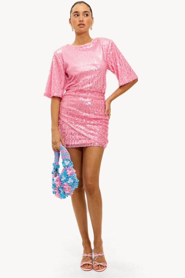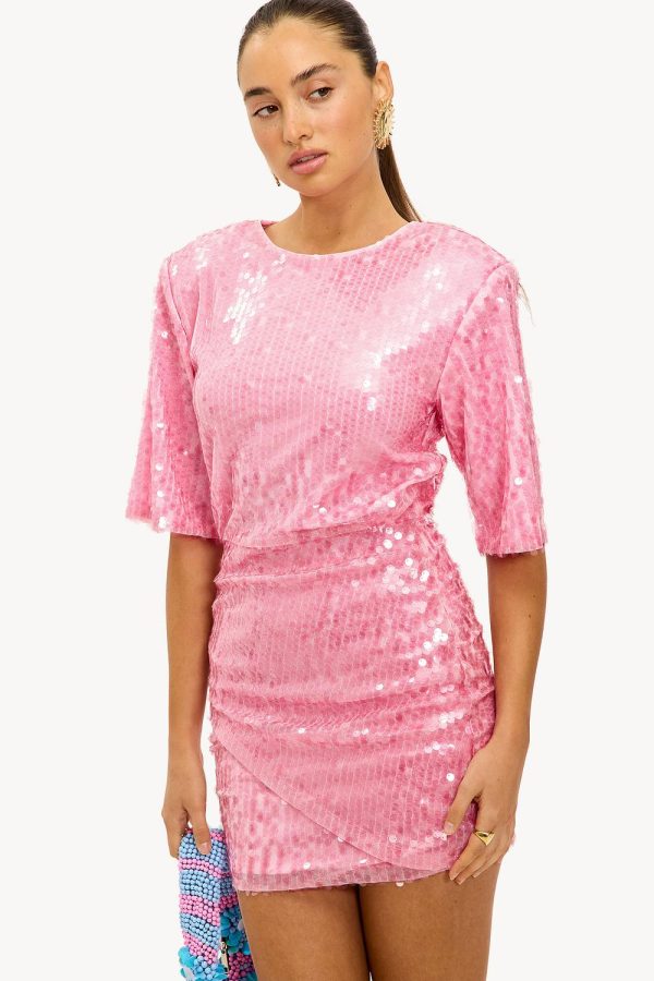 Deze roze mini dress heeft all-over sequins met een subtiel verticaal patroon. De bodycon fit met gedrapeerde details bij de taille accentueert de shape op een elegante manier. De statement mouwen en ronde hals maken deze dress perfect voor een glamorous night out.Model informatie: Shana is 179 cm en draagt maat S.