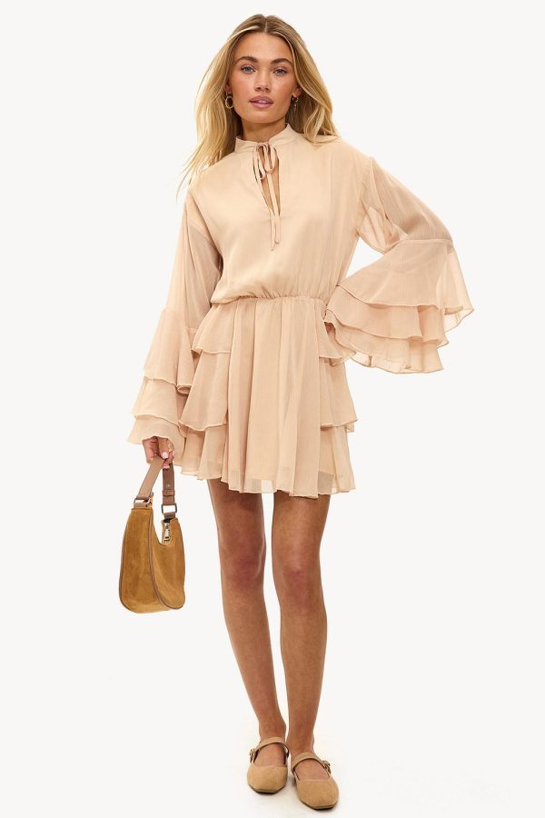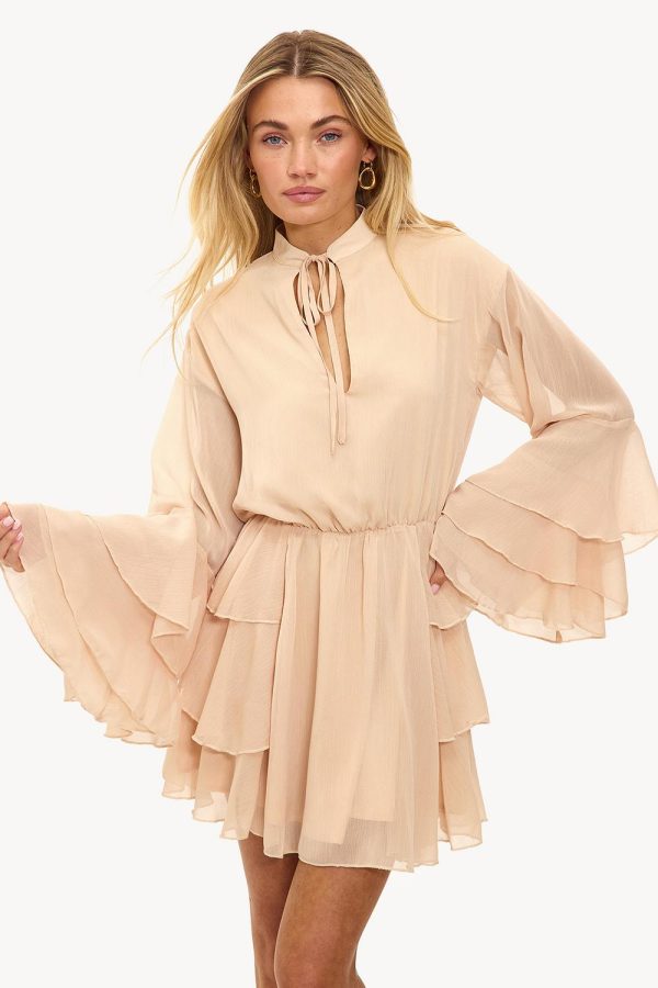 Deze zandkleurige mini dress heeft een elegante tie-neck en statement bell sleeves met ruffle details. De getailleerde pasvorm met gelaagde ruches in de rok creëert een luxe look. Style deze dress met gouden accessoires voor een chique dinner date.Model informatie: Devon is 174 cm en draagt maat XS.