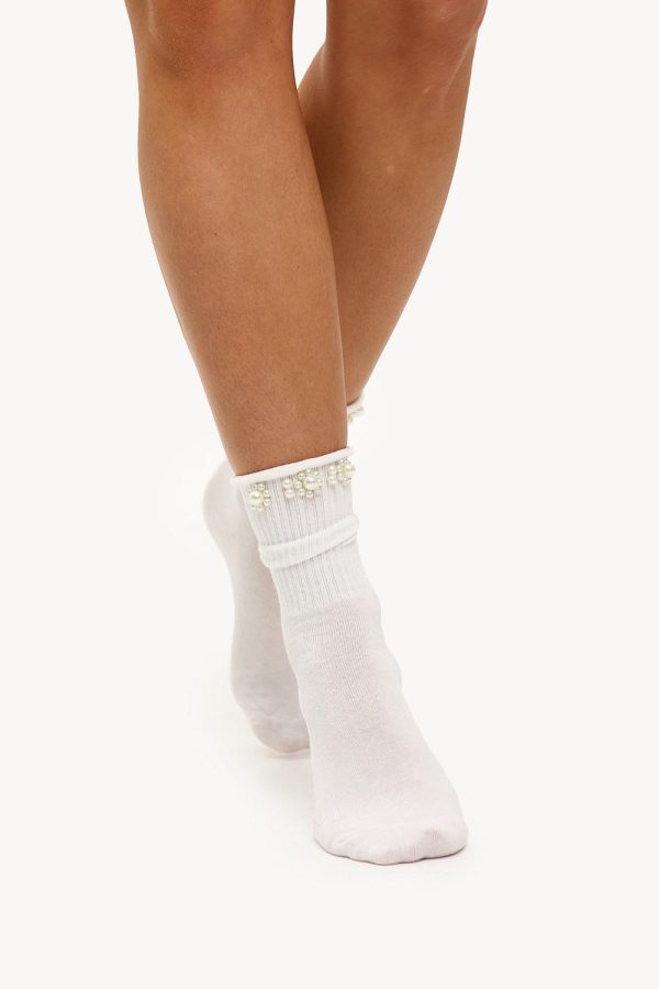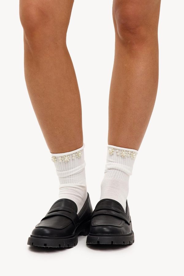 Deze witte socks hebben een luxe touch met statement pearl details aan de bovenrand. De ribbed structuur en comfortabele pasvorm maken deze socks perfect voor een coole update van je outfit. Style ze met loafers voor een chique twist aan je look.