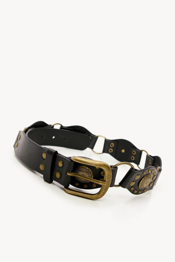 Deze zwarte cowboy belt heeft statement gouden studs en decoratieve medallions voor een western twist. De gouden gesp en O-ring details geven deze riem een luxe update. Style deze belt met een mini skirt voor een coole festival look.