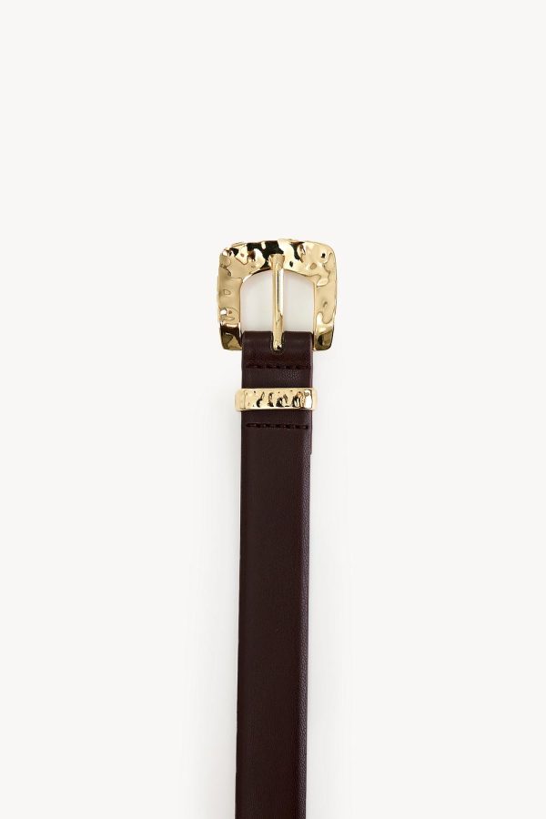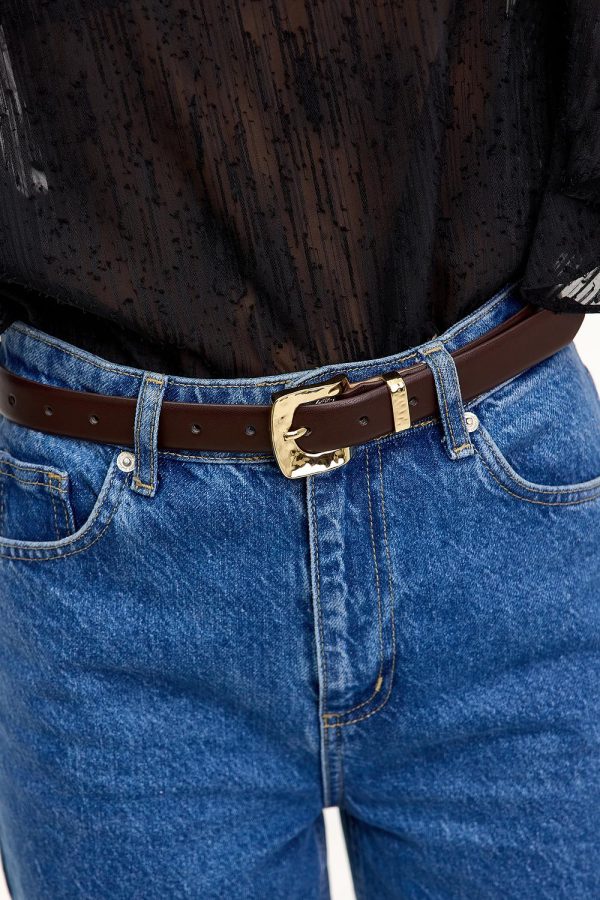 Deze bruine riem heeft een luxe gouden gesp met een modern textured design. De smalle leather-look riem met subtiele stiksels creëert een chique accent voor je outfit. Style deze riem met een high-waisted jeans voor een on trend look.