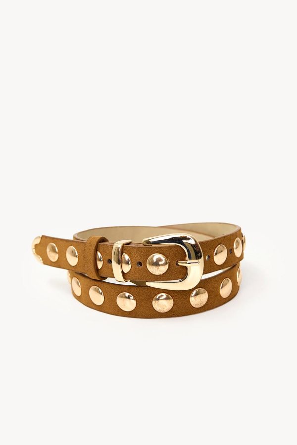 Deze camelkleurige riem heeft een luxe suède-look met gouden studs all-over. De smalle vorm met goudkleurige gesp creëert een statement detail voor je outfit. Style deze riem met een high-waisted jeans voor een chique accent.