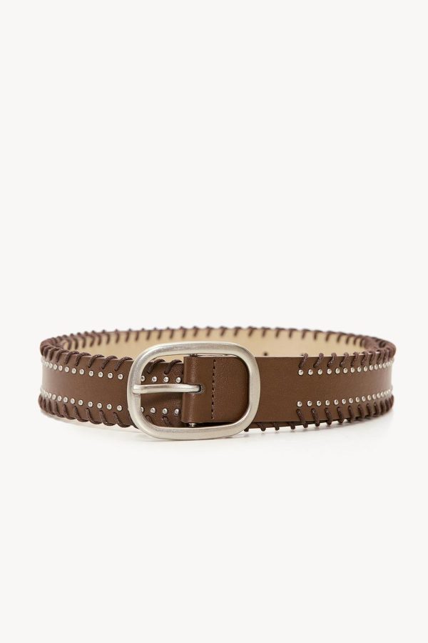 Deze bruine riem heeft een statement design met zilveren studs langs de randen. De ovalen gesp en luxe textured afwerking geven een western twist aan het design. Style deze riem met denim voor een coole look.