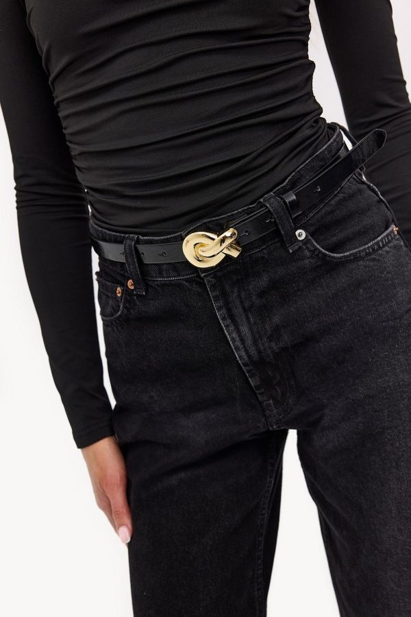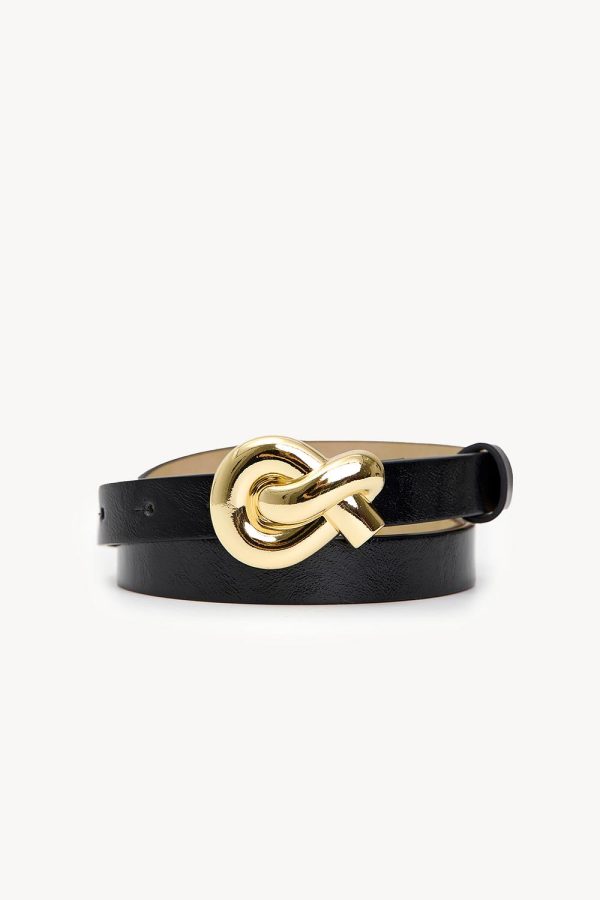Deze zwarte riem heeft een statement gouden gesp in een uniek knoop design. De smalle leather-look band met subtiele merkdetails creëert een luxe look. Style deze riem met een high-waisted jeans voor een chique touch.