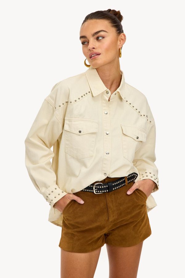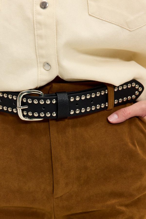 Deze zwarte riem heeft een statement look met studs all-over. De klassieke gesp en dubbele rij studs geven een coole rock ’n roll twist. De riem is perfect om je taille te accentueren en voegt direct edge toe aan je outfit.