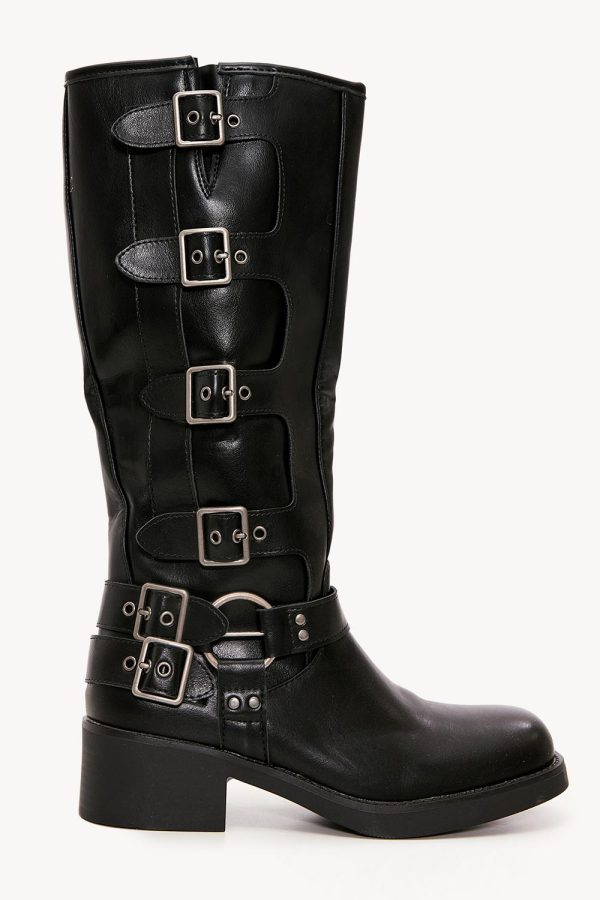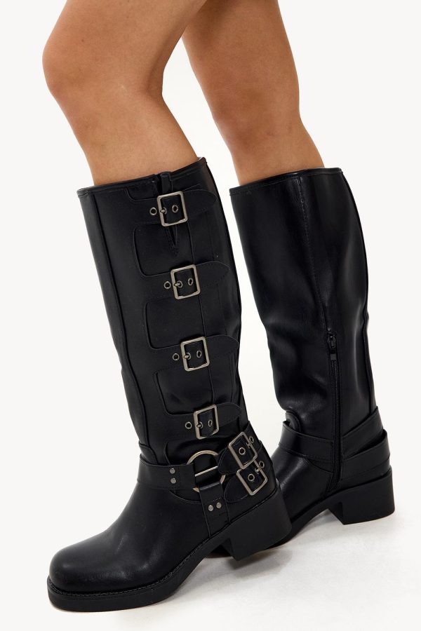 Deze zwarte knee-high boots hebben een statement design met opvallende zilveren gespen. De stoere boots zijn voorzien van decoratieve riemen en studs details voor een edgy look. De chunky hak en platform zool geven deze boots een coole twist.