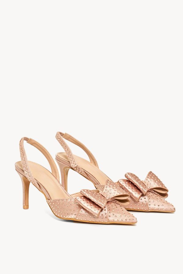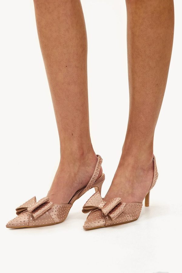 Deze beige slingback pumps hebben een luxe shimmering finish met statement studs all-over. De pointed toe met opvallende bow detail en kitten heel zorgen voor een elegante look. De slingback band met elastiek geeft extra comfort tijdens een dinner date.
