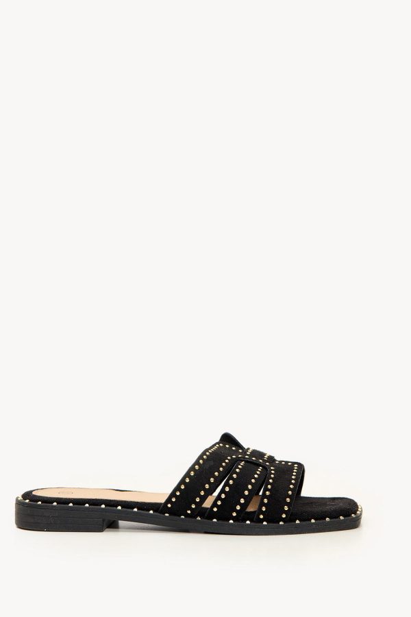 Deze zwarte slippers hebben een luxe design met opvallende studs details. De gevlochten bandjes en statement studs all-over geven een coole twist aan dit zomerse design. De platte zool met subtiele rand afwerking zorgt voor een chique look.