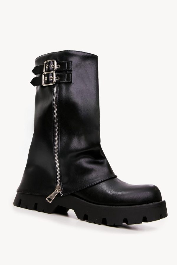 Deze zwarte biker boots hebben een stoere chunky sole en statement zijrits. De boots zijn afgewerkt met decoratieve gespen en hebben een leather-look finish. De robuuste zool en ronde neus geven deze boots een coole edge.