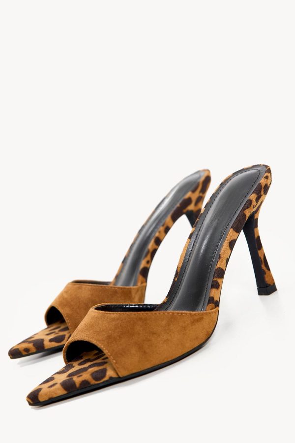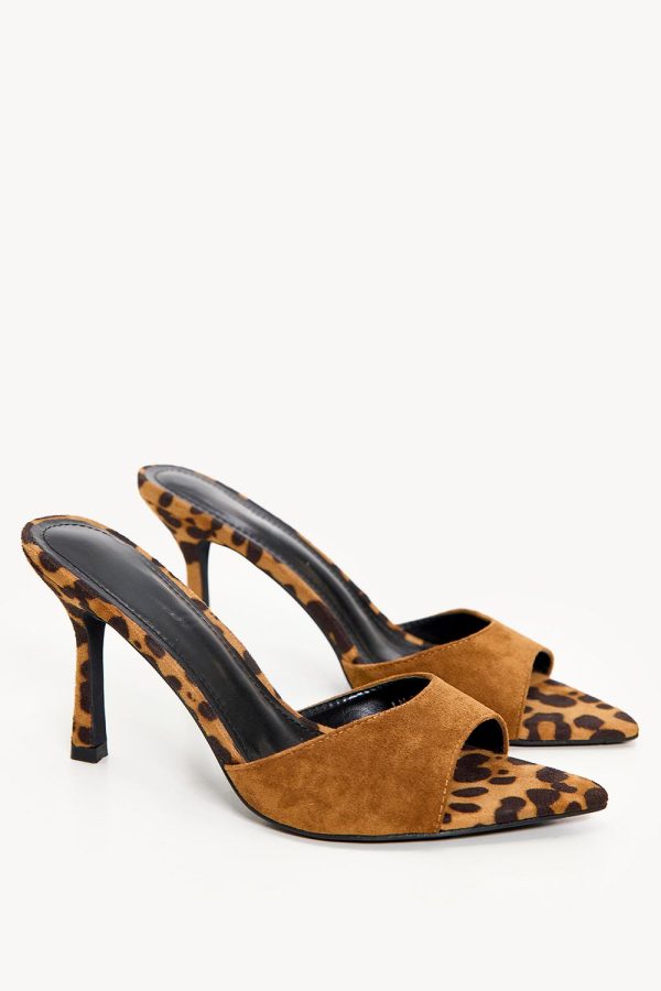 Deze statement heels combineren een cognac suede-like band met een luxe leopard print design. De pointed toe en elegante stiletto heel zorgen voor een sophisticated look. De mule style met open hiel maakt deze heels perfect voor een dinner date.