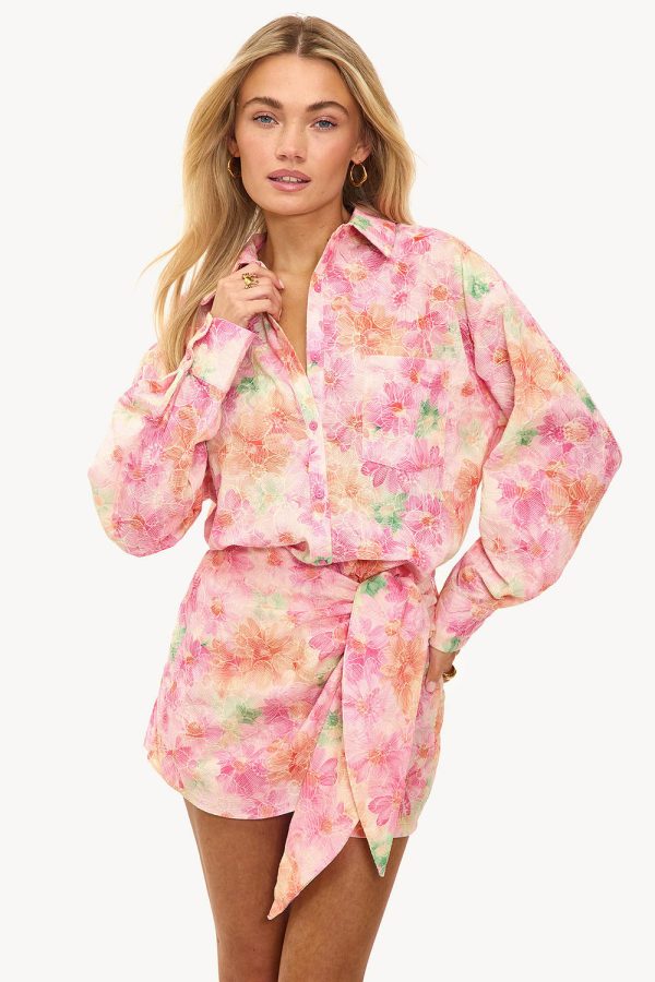 Deze roze skort heeft een romantische bloemenprint in zachte watercolor tinten. De wrap-style met statement strik detail creëert een moderne shape. De oversized fit met statement sleeves maakt deze skort perfect voor een lunch break look.Model informatie: Devon is 174 cm en draagt maat XS.