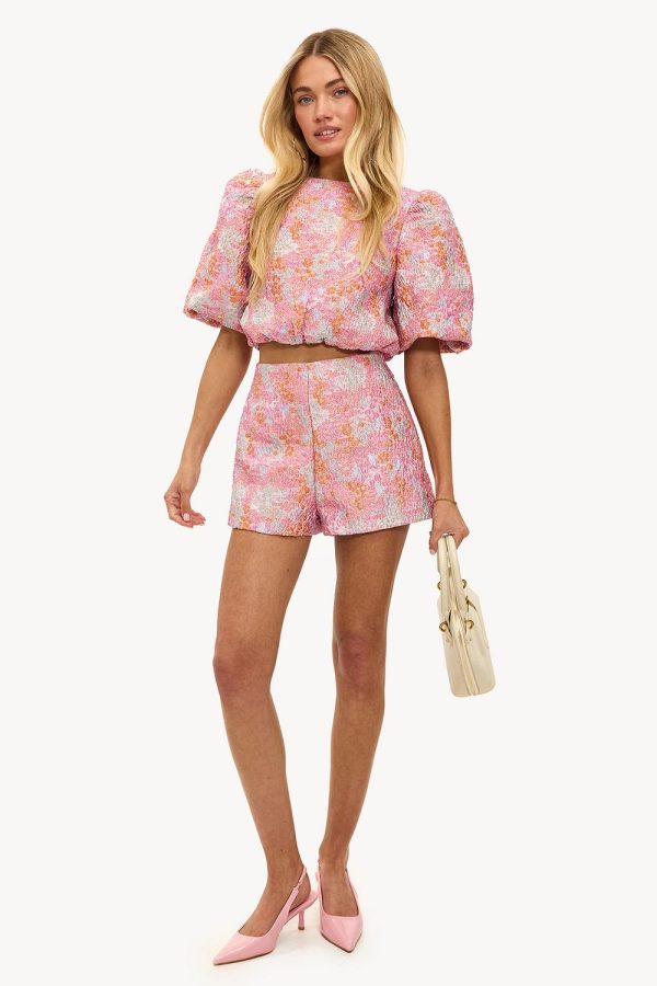 Deze roze short heeft een luxe jacquard design met subtiele pastelkleurige details. De high-waisted fit met losse pijpen creëert een elegante shape. Style deze short met de matching top voor een stunning co-ord look.Model informatie: Devon is 174 cm en draagt maat XS.
