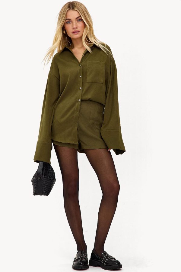 Deze olijfgroene blouse heeft een oversized fit met statement wide sleeves. De button-up voorzijde met borstzak en brede manchetten geven een luxe twist aan het design. Style deze blouse met een high-waisted broek voor een coole office look.Model informatie: Devon is 174 cm en draagt maat XS.